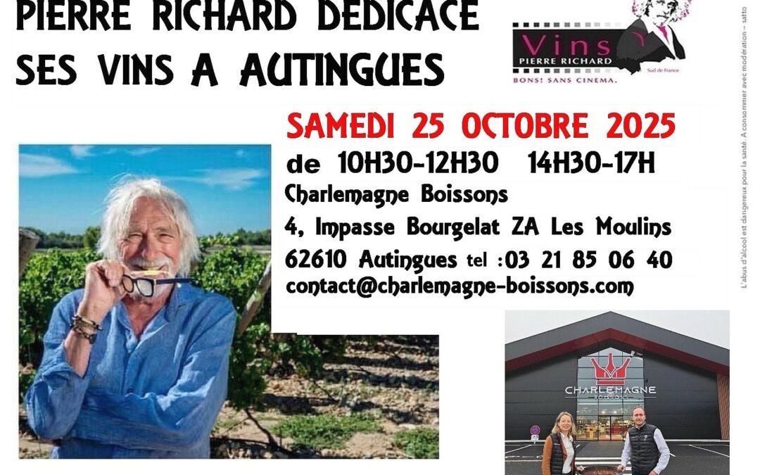 CHARLEMAGNE BOISSONS vous accueillent le samedi 25 Octobre 2025 avec la présence de PIERRE RICHARD pour une séance de dédicaces de 10h30 à 12h30 et de 14h30 à 17h. Vous y retrouverez nos VINS.